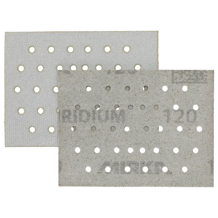 Iridium is a premium paper abrasive for universal sanding. Perfected for speed and efficiency, it has a mix of ceramic and aluminum oxide grains on a flexible paper backing and a precision coating that prevents clogging and reduces pilling. It practically repels dust, and its usable life is increased as the grains stay sharp for longer. Dust extraction is optimized with multihole patterns for discs and strips. Iridium delivers amazing results on both soft and hard surfaces, making it the ideal paper abrasive choice for professionals in any industry.